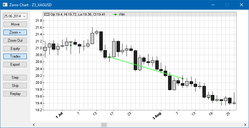 You can replay or single step through a strategy for examining the trade behavior in detail. Use the [Asset] scrollbox to select the asset to be observed, then click [Step] or [Replay] for stepping through the backtest or replaying it in reduced speed. [Step] moves one bar forward, [Skip] moves to the next bar at which a trade opens or closes. The two buttons also appear on the Zorro main window.