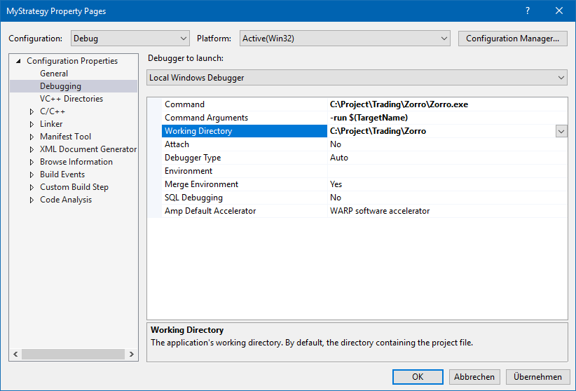 Visual Studio. For a 64-bit project, give the path to Zorro64.exe