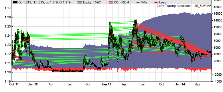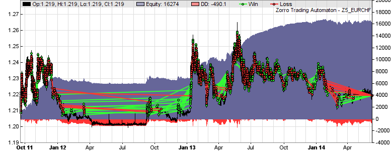 EUR/CHF grid trader, virtual hedging, 261 trades, avg duration