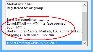 You should see the broker's name in Zorro's message window on login, and a "Zorro connected" comment in the upper left corner of the