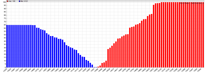 The above histogram is generated from a order flow distribution analysis. The height of a bar is the cumulative volume of a price in the order book, blue for bid and red for ask prices. The volume is expressed as a 0..1 percentage of the total ask or bid volume, whichever is higher. You can see that the situation in the diagram is dominated by offers (100% vs. 65%), which might indicate a further falling bitcoin price.