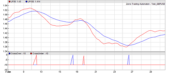 Most trade systems analyze the recent price curve with functions or indicators that introduce more or less lag. This means that trade signals are always late, which reduces the profit of a system. One way to minimize lag is using low-lag functions (for instance, higher-order lowpass filters instead of moving averages). Another way is predicting the signals before they actually occur. This is the purpose of the predict function that works by extrapolating signal curves into the future.