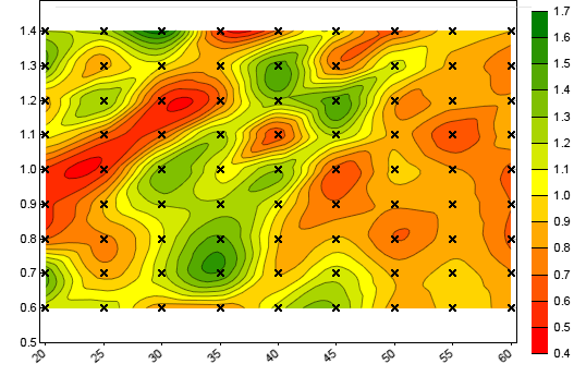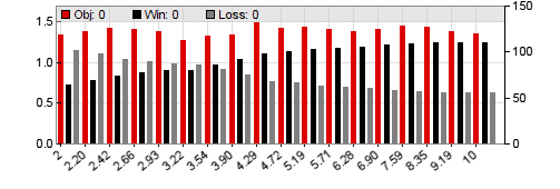 The charts are stored in the Log folder and end with the number of the parameter, f.i. _p1 for the first, _p2 for the second parameter and so on. The red bars are the result of the objective function, which is by default the profit factor of the training period, corrected by a factor for preferring a higher number of trades. The grey bars show the number of losing trades and the black bars show the number of winning trades. In walk forward optimization, the parameter charts display the average results over all WFO cycles. Genetic or brute force optimization does not generate parameter charts, but contour plots from the first two parameters as shown below.