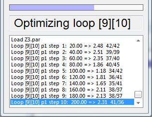 The displayed values per line are the loop and parameter number, the optimization step, the parameter value, the result of the objective function, and the number of winning and losing trades.