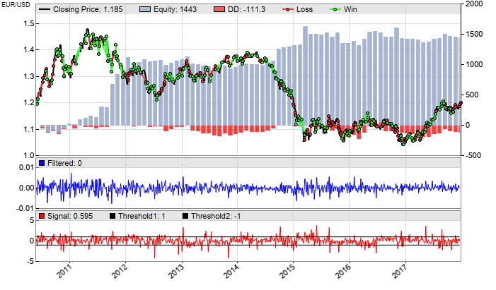 The blue curve in the middle window is the plot of the Filtered series. It shows the price fluctuation in the range of about +/-0.005, equivalent to about 50 pips. The bottom window displays the Signals series. The black lines are the thresholds that trigger buy and sell signals when Signals crosses over or under them. Plotting variables and series in the chart greatly helps to understand and improve the trade rules. For examining a part of the chart in details, the PlotDate and PlotBars variables can be used to 'zoom into' a part of the chart.