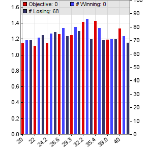The parameter charts show how the parameter values affect the performance of the strategy. The red bars are the return ratio of the training period - that's basically the total win divided by the total loss, multiplied by a penalty factor for less trades. The dark blue bars are the number of losing trades and the light blue bars are the number of winning trades. We can see that the time period produces slightly increasing returns up to about 35, then the returns go down. Threshold has the best performance at about 1.0. The stop factor - the third parameter - slightly goes up and has a maximum at about 7. We can also see here that a distant stop, although it increases the risk and eventually reduces the profit, achieves a higher number of profitable trades and thus a better 'accuracy' of the strategy.