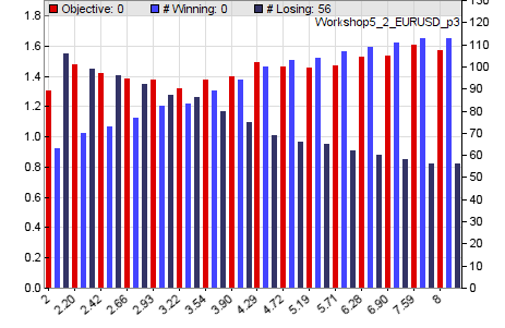 All red bars ending above 1.0 indicate a profitable parameter combination. In this case they stay above 1.0 over the whole range, which means that the strategy performance is quite robust and not very sensitive to parameter changes. The optimized parameters are stored in the file Data/Workshop5_EURUSD.par (the file name would be different for other assets).