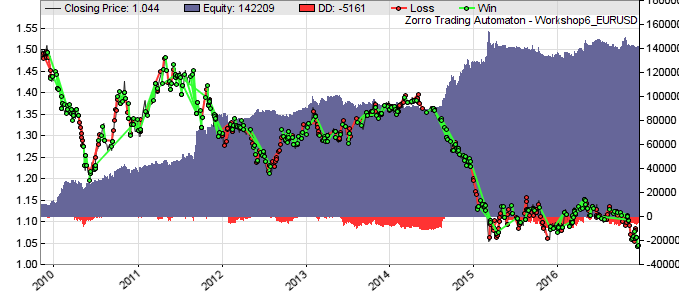 In the strategy above we have some parameters that are optimized, and some are not, like the ATR period, the MMI period, or the number of WFO cycles. Hoiw do we know which parameters are to be optimized and which are not? And how do we know that the functions we used, LowPass, BandPass, and FisherN, are the best for our purpose? Finding out normally requres lengthy experimenting. The evaluation shell (available in Zorro Z version 3 and above) can takle over most of the work and automatically generate the best function and parameter combinations for such a strategy. You can find details, and a variant of this workshop with the shell and a short tutorial, in the Evaluation Shell chapter.