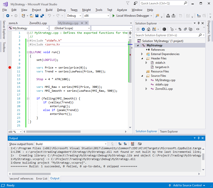 - Now you're all set to debug your strategy with Visual Studio. Always include