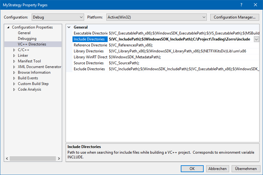 - General > VC++ Directories. Add your Zorro
