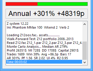 The test runs through one or many sample cycles, either with the full historical price data set, or with out-of-sample subsets. It generates a number of equity curves that are then used for a Monte Carlo Analysis of the strategy. The optional Walk Forward Analysis applies different parameter sets for staying always out-of-sample. Several switches (see Mode) affect test and data selection. During the test, the progress bar indicates the current position within the test period. The lengths of its green and red area display the current gross win and gross loss of the strategy. The result window below shows some information about the current profit situation, in the following form: