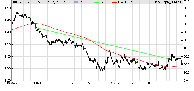 The red line in the chart above is the Trends series. You can see that it has a peak at the end of September, so the peak(Trends) function returned true and enterShort was called. The tiny green dot is the moment where the short trade was entered. The Trends series continues down all the way until November 23, when a valley was reached. A long trade (not shown in this chart) was then entered and the short trade was automatically closed. The green line connects the entry and exit points of the trade. It was open almost 2 months, and made a profit of ~ 13 cents per unit, or 1300 pips.